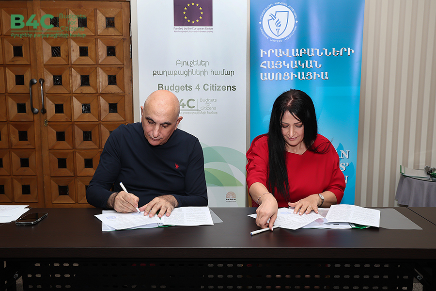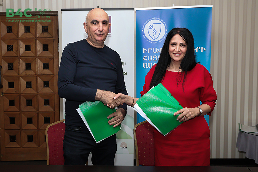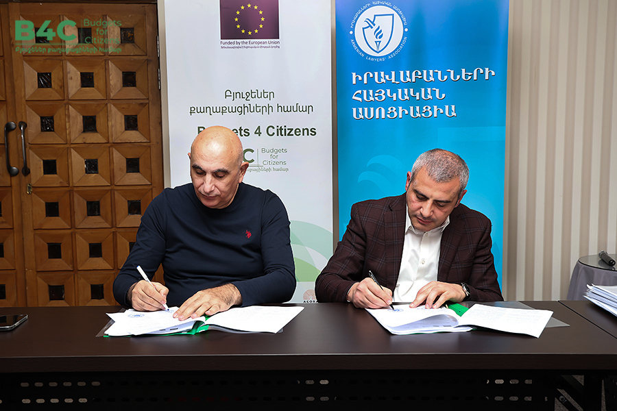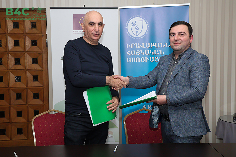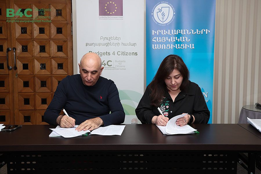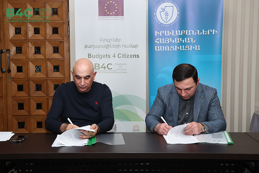 2026 թվականի մարտի 20-ին տեղի է ունեցել «Իրավաբանների հայկական ասոցիացիա» հասարակական կազմակերպության կողմից՝ «Տնտեսական զարգացման և հետազոտությունների կենտրոն» հասարակական կազմակերպության և «Ագորա Սենթրլ Յուրոփ» հասարակական կազմակերպության հետ համագործակցաբար իրականացվող «Բյուջեներ քաղաքացիների համար» ծրագրի շրջանակում քաղաքացիական հասարակության ներկայացուցիչների հետ շահերի պաշտպանության ենթադրամաշնորհային համաձայնագրերի կնքման հանդիսավոր արարողությունը և ենթադրամաշնորհառուների համար նախատեսված պարտադիր մեկօրյա ուսուցումը։ Ծրագիրն իրականացվում է Եվրոպական միության ֆինանսական աջակցությամբ։