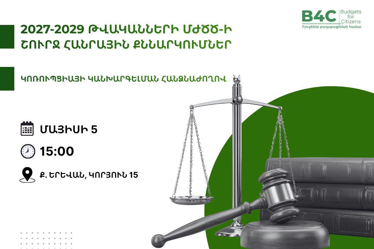 2027թ. բյուջետային գործընթացի շրջանակներում, Կոռուպցիայի կանխարգելման հանձնաժողովը 2026թ. մայիսի 5-ին ժամը 15:00 նախատեսում է իրականացնել քննարկումներ քաղաքացիական հասարակության կազմակերպությունների ներկայացուցիչների հետ, որը տեղի կունենա Հանձնաժողովի վարչական շենքում՝ ք. Երևան, Կորյուն 15: