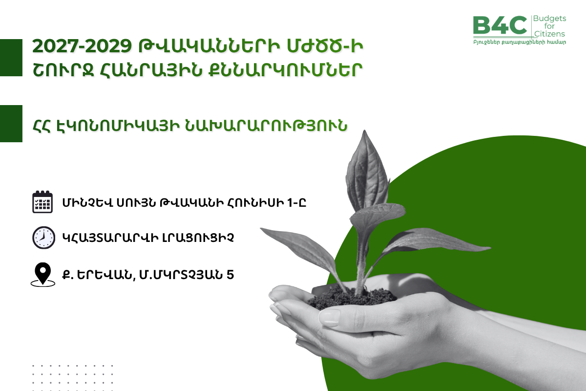 ՀՀ էկոնոմիկայի նախարարությունը Հայաստանում պաշտոնապես գործող հասարակական կազմակերպություններին, արհեստակցական միություններին, մասնագիտական ասոցիացիաներին, մեդիա խմբերին, հիմնադրամներին և քաղաքացիների այլ խմբերին հրավիրում է մասնակցելու 2027-2029 թվականների միջնաժամկետ ծախսերի ծրագրերի (ներառյալ ՀՀ 2027 թվականի բյուջետային ֆինանսավորման) հայտերի շուրջ կազմակերպված հանրային քննարկումներին: