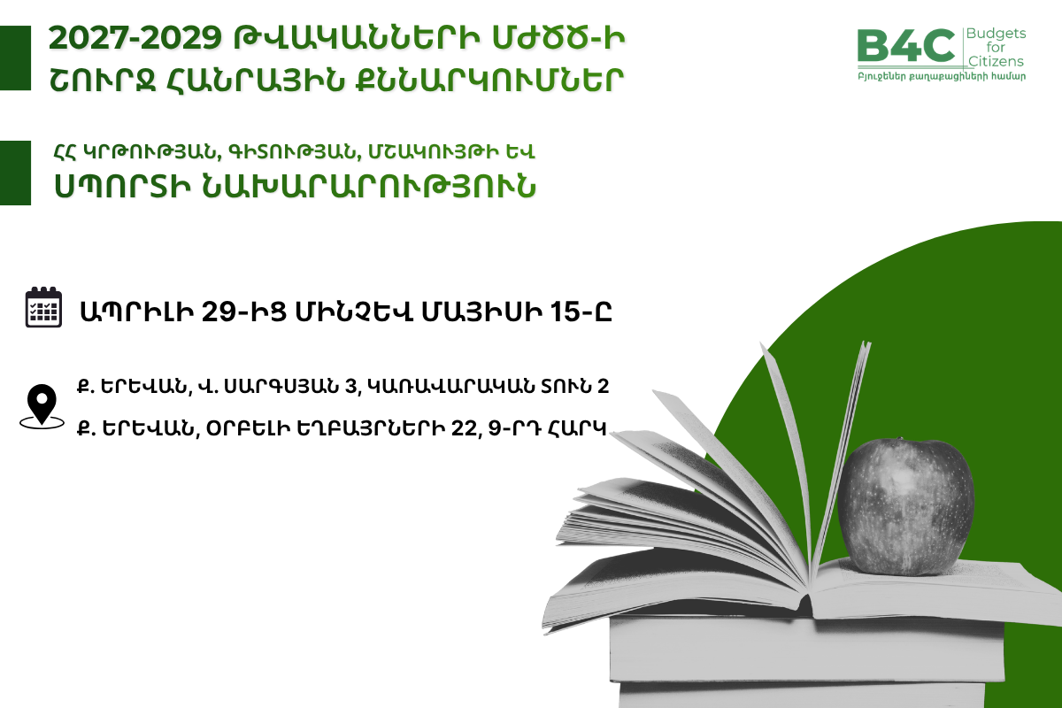 Բարձրագույն կրթության և գիտության ոլորտների 2027-2029թթ. ՄԺԾԾ նախագծի շուրջ հանրային քննարկումը տեղի կունենա Բարձրագույն կրթության և գիտության կոմիտեում (հասցե՝ ք. Երևան, Օրբելի եղբայրների 22, 9-րդ հարկ):