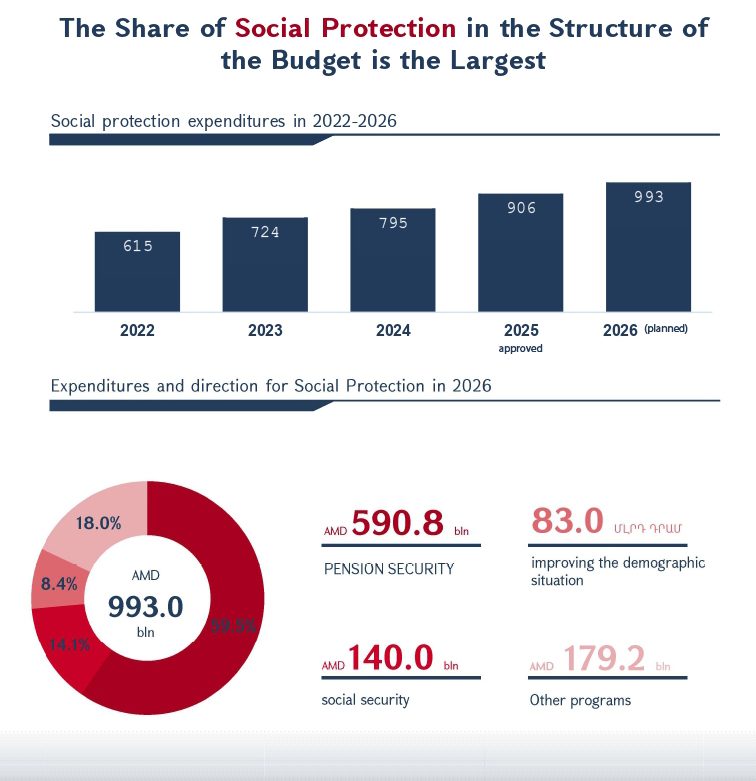 The 2026 state budget plans to allocate more than AMD 993.0 bln to social protection, which constitutes 27.4% of the planned expenditures of the state budget.