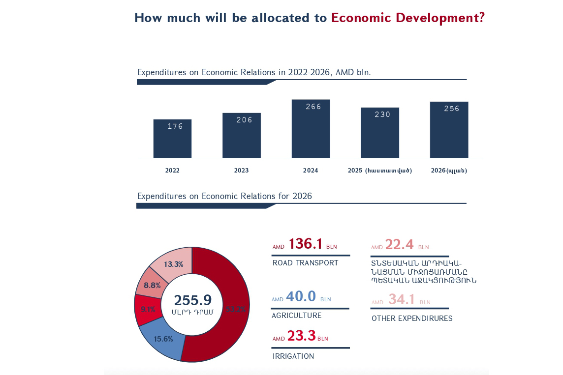 The Government plans to allocate AMD 255.9 bln from the 2026 state budget to economic relations, which amounts to 7.1% of the planned expenditures of the state budget.