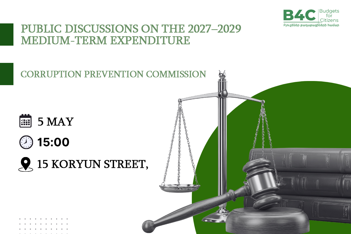 Within the framework of the 2027 budget process, the Corruption Prevention Commission plans to hold discussions with representatives of the civil society organizations on 5 May, 2026, at 15:00. The discussions will take place at the administrative building of the Commission at 15 Koryun Street, Yerevan.
